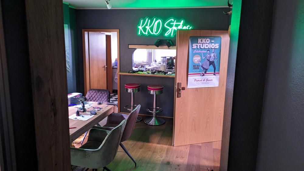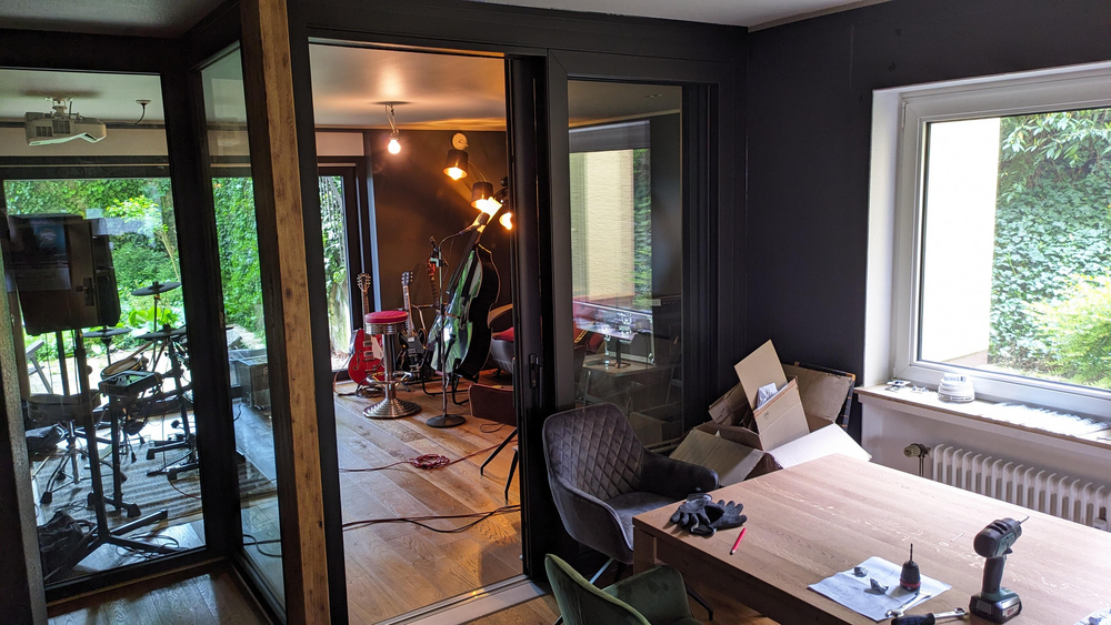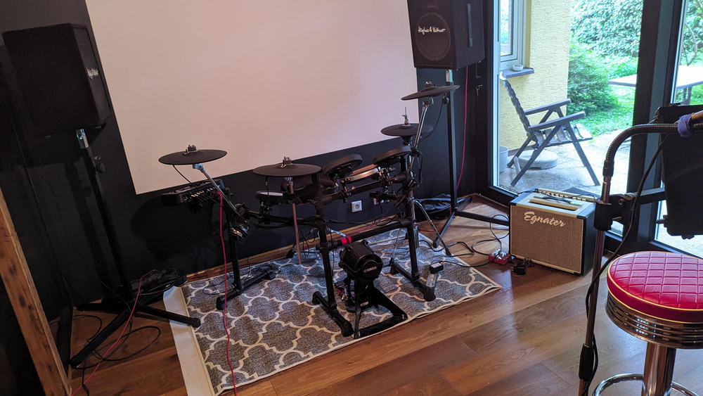 Eigener Proberaum, der auch als Recording Studio funktioniert mit allerlei PA-Equipment und was man halt so braucht.